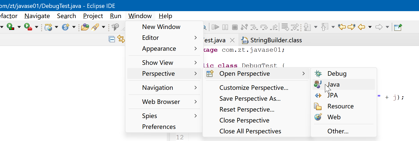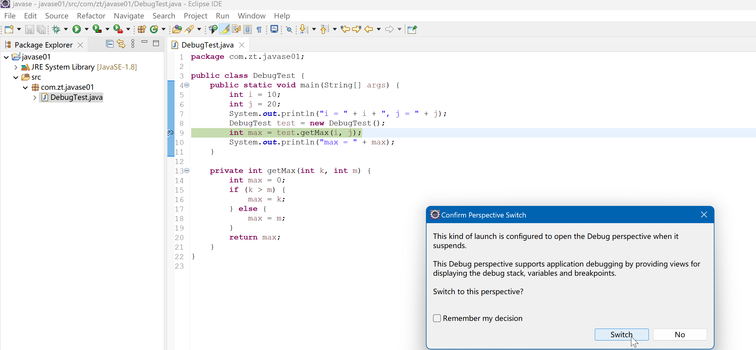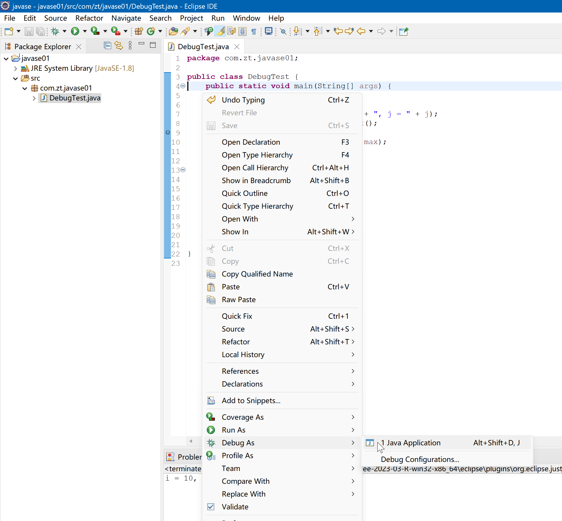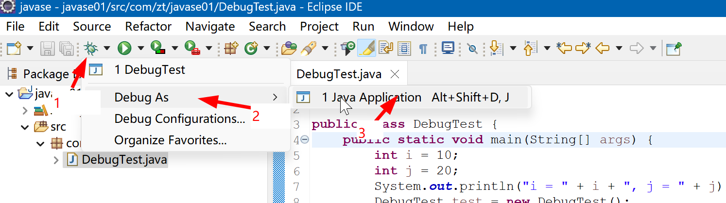 可以看到断点打在第9行代码, eclipse在执行第9行代码前暂停, 在Variables视图可以看到main方法中局部变量i=10, j=20, test为DebugTest类型
