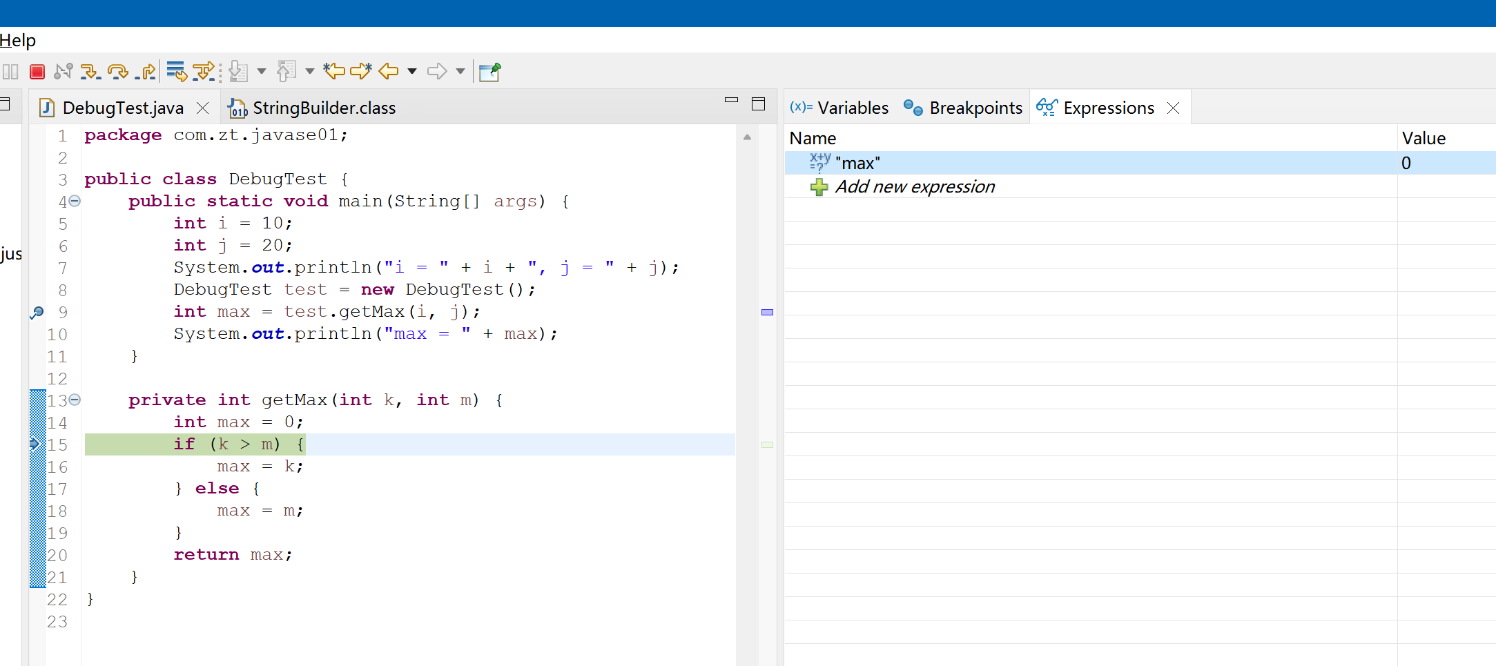 expressions页可以输入一些语句执行,例如下图中在执行到15行时在expressions页输入max, 对应value就显示了值, 如果输入max==0, 那么value处就是显示的true, 这个expressions页面甚至可以在代码执行前修改局部变量的值, 让程序以被修改后的值继续向下执行