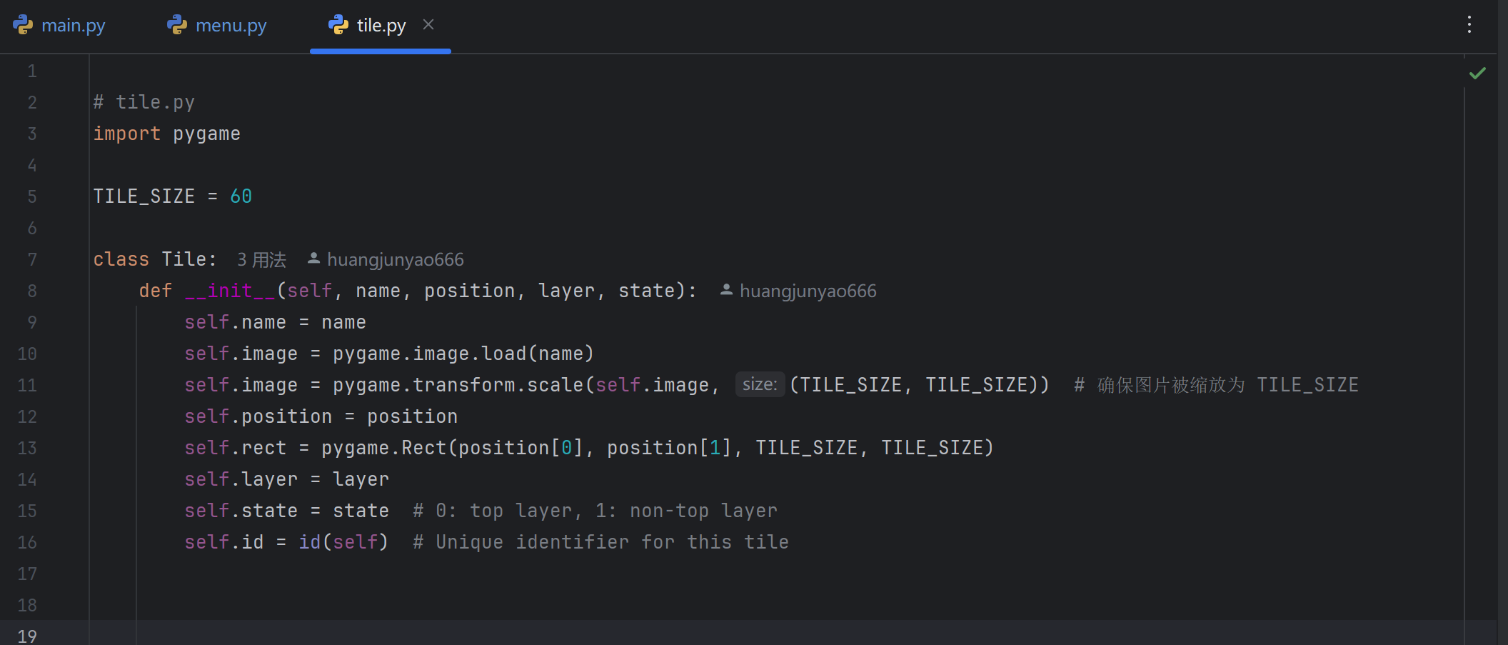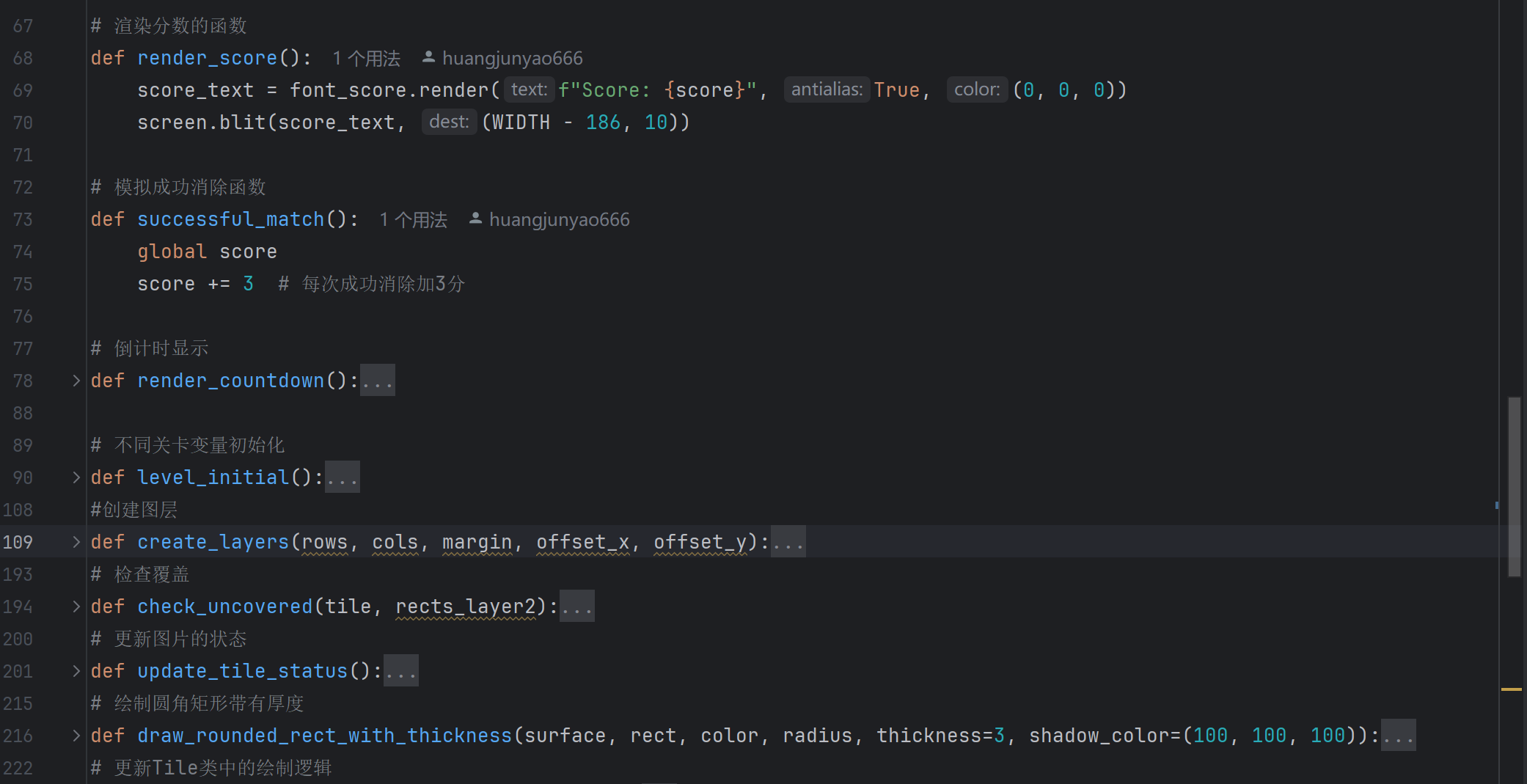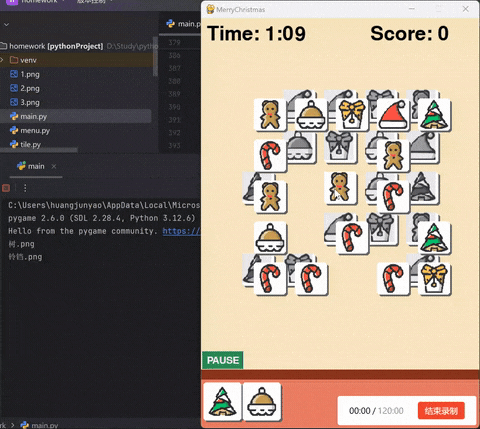 - 游戏逻辑:使用Python编写游戏逻辑,通过Pygame库管理游戏的渲染和事件处理。实现了游戏的核心功能,包括卡片的匹配、分数统计和游戏状态管理。