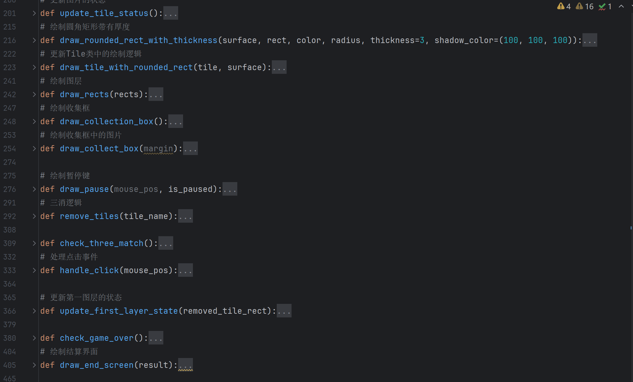 - 算法设计:采用随机生成算法保证游戏中的卡片布局,同时确保每种类型的卡片数量为3的倍数,以便实现匹配功能。算法中加入了检查机制,以防止生成的卡片数量与游戏网格不匹配的问题。
