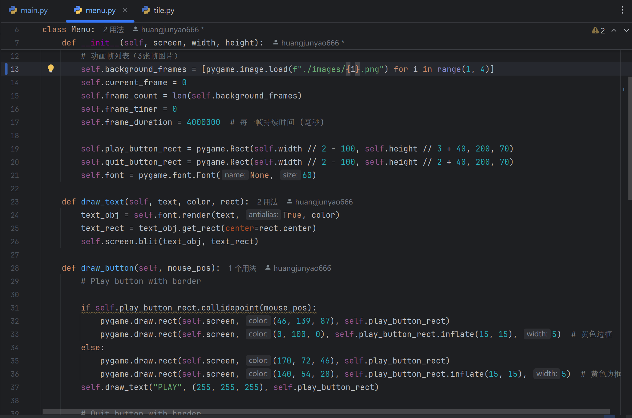 在9月15日的时候,我对python还一无所知,大概用了三天时间,实现了python学习的入门到入土。写完游戏以后,我现在看到代码就想吐。因为这个,我的中秋假期直接蒸发。写这个游戏我收获很多,比如python知识的学习,比如和gpt交流的能力得到强化。只要进行有效的沟通,说清楚自己的需求,gpt都能大概实现。使用的感受是,如果不学点技术的话,迟早会被ai取代。💡1. 游戏功能实现