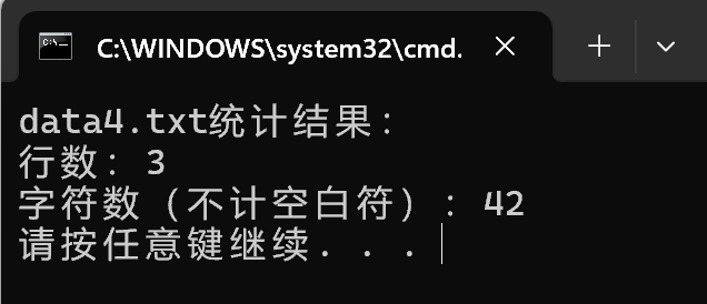 #include <stdio.h> # define N 10 # define M 30 int count_line(); int count_words(); int main() { printf("data4.txt统计结果:\n"); printf("行数:%d\n", count_line()); printf("字符数(不计空白符):%d\n", count_words()); return 0; } int count_line() { int acount = 0; char line[M]; FILE *fp; fp = fopen("E:\\学科资料(整理)\\大一下\\C语言实验\\实验7数据文件及部分代码\\实验7数据文件及部分代码\\data4.txt", "r"); if (!fp) { printf("fail to open file to read\n"); return -1; } while (fgets(line, M, fp) != NULL) { acount++; } fclose(fp); return acount; } int count_words() { int char_count = 0; char line[M]; FILE *fp; fp = fopen("E:\\学科资料(整理)\\大一下\\C语言实验\\实验7数据文件及部分代码\\实验7数据文件及部分代码\\data4.txt", "r"); if (!fp) { printf("fail to open file to read\n"); return -1; } while (fgets(line, M, fp) != NULL) { for (int i = 0; line[i] != '\0'; i++) { if (line[i] != ' ' && line[i] != '\t' && line[i] != '\n' && line[i] != '\r') { char_count++; } } } fclose(fp); return char_count; }