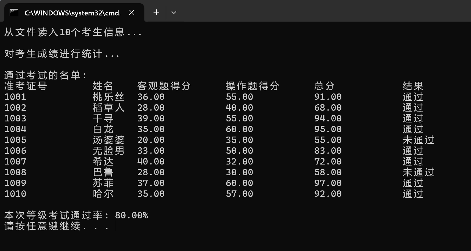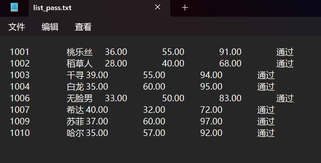 #include <stdio.h> #include <string.h> #define N 10 typedef struct { long id; // 准考证号 char name[20]; // 姓名 float objective; // 客观题得分 float subjective; // 操作题得分 float sum; // 总分 char result[10]; // 考试结果 } STU; // 函数声明 void read(STU st[], int n); void write(STU st[], int n); void output(STU st[], int n); int process(STU st[], int n, STU st_pass[]); int main() { STU stu[N], stu_pass[N]; int cnt; double pass_rate; printf("从文件读入%d个考生信息...\n", N); read(stu, N); printf("\n对考生成绩进行统计...\n"); cnt = process(stu, N, stu_pass); printf("\n通过考试的名单:\n"); output(stu, N); // 输出所有考生完整信息到屏幕 write(stu, N); // 输出考试通过的考生信息到文件 pass_rate = 1.0 * cnt / N; printf("\n本次等级考试通过率: %.2f%%\n", pass_rate*100); return 0; } // 把所有考生完整信息输出到屏幕上 // 准考证号,姓名,客观题得分,操作题得分,总分,结果 void output(STU st[], int n) { int i; printf("准考证号\t姓名\t客观题得分\t操作题得分\t总分\t\t结果\n"); for (i = 0; i < n; i++) printf("%ld\t\t%s\t%.2f\t\t%.2f\t\t%.2f\t\t%s\n", st[i].id, st[i].name, st[i].objective, st[i].subjective, st[i].sum, st[i].result); } // 从文本文件examinee.txt读入考生信息:准考证号,姓名,客观题得分,操作题得分 void read(STU st[], int n) { int i; FILE *fin; fin = fopen("E:\\学科资料(整理)\\大一下\\C语言实验\\实验7数据文件及部分代码\\实验7数据文件及部分代码\\examinee.txt", "r"); if (!fin) { printf("fail to open file\n"); return; } while (!feof(fin)) { for (i = 0; i < n; i++) fscanf(fin, "%ld %s %f %f", &st[i].id, st[i].name, &st[i].objective, &st[i].subjective); } fclose(fin); } // 把通过考试的考生完整信息写入文件list_pass.txt // 准考证号,姓名,客观题得分,操作题得分,总分,结果 void write(STU s[], int n) { int i; FILE *fp; fp = fopen("E:\\学科资料(整理)\\大一下\\C语言实验\\程序练习\\strawpaper\\strawpaper\\list_pass.txt","w"); if(fp==NULL) { printf("fail to open file to write\n"); return; } for(i=0;i<n;++i) { if(s[i].sum>=60) { fprintf(fp,"%ld\t\t%s\t%.2f\t\t%.2f\t\t%.2f\t\t%s\n", s[i].id, s[i].name, s[i].objective, s[i].subjective, s[i].sum, s[i].result); } } fclose(fp); } // 对考生信息进行处理:计算每位考生考试总分、结果;统计考试通过的人数 int process(STU st[], int n, STU st_pass[]) { int i, j=0; for(i=0;i<n;++i) { st[i].sum = st[i].objective+st[i].subjective; if(st[i].sum>=60) { strcpy(st[i].result, "通过"); st_pass[j++]=st[i]; } else strcpy(st[i].result, "未通过"); } return j; }