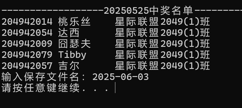 #include<stdio.h> #include<string.h> #include<time.h> #include<stdlib.h> #define N 5 #define M 80 struct student { char id[10]; char name[10]; char num_class[30]; }STU; int main() { struct student x[M], y[N]; char name_file[50]; char filePath[200]; int i=0,j=0, k,number; FILE *fp; srand(time(NULL)); printf("------------------20250525中奖名单-------------------\n"); fp = fopen("E:\\学科资料(整理)\\大一下\\C语言实验\\实验7数据文件及部分代码\\实验7数据文件及部分代码\\list.txt","r"); if(!fp) { printf("fail to open file to read\n"); return 0; } while(!feof(fp)) { number = fscanf(fp, "%s%s%s", x[i].id, x[i].name,x[i].num_class); if(number != 3) break; i++; } fclose(fp); while(j<5) { k=rand()%79; y[j++]=x[k]; printf("%-10s%-10s%-30s\n", x[k].id, x[k].name, x[k].num_class); } printf("输入保存文件名:"); scanf("%s",name_file); sprintf(filePath, "E:\\学科资料(整理)\\大一下\\C语言实验\\实验7数据文件及部分代码\\实验7数据文件及部分代码\\%s.txt", name_file); fp=fopen(filePath,"w"); if(fp==NULL) { printf("fail to open file to write\n"); return 0; } for(j=0;j<N;++j) { fprintf(fp,"%-10s%-10s%-30s\n",y[j].id, y[j].name,y[j].num_class); } fclose(fp); return 0; }