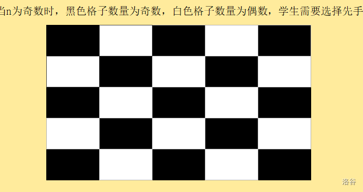 - 当 \(n×n\) 为奇数时(也可以说当 \(n\) 为奇数时),白格数量为偶数,黑格数量为奇数,学生需要先手,染黑格,教授后面只能染黑格,学生胜。