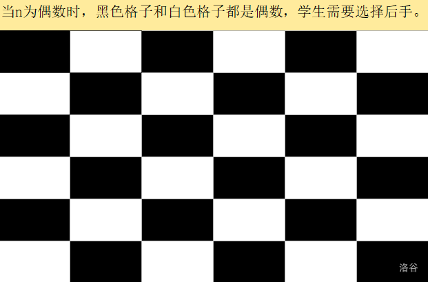 - 当 \(n×n\) 为偶数时(也可以说当 \(n\) 为偶数时),白格数量和黑格数量都是偶数,学生后手赢。