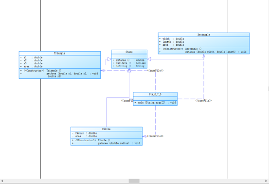 阅读完题目后,因为有Circle、Rectangle、Triangle 三个对象,所以会首先想到创建三个不同的类,在各自的类中实现各自的功能,并且在各自的类中判断输入是否符合规则,在主函数中实现从键盘输入。 题目中要求将图形根据面积排序,通过数组可以实现,将图形的面积保存在数组中。