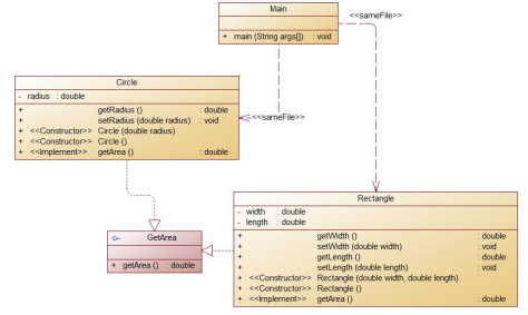 Circle及Rectangle分别为圆类及矩形类,分别实现GetArea接口