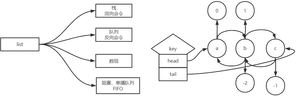 - 双向链表,key中有head和tail指向list的第一个以及最后一个元素。