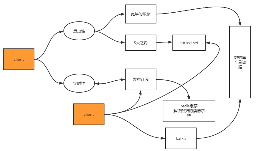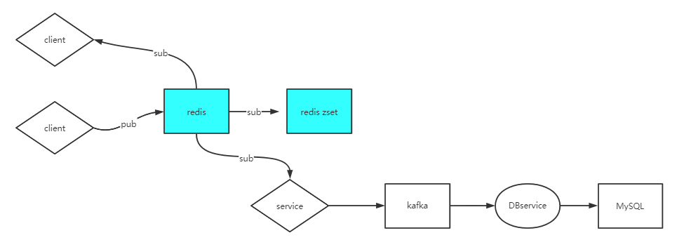 - 客户端推送消息到消息订阅,使用命令将消息发送到zset中,通过kafka将数据保存到数据库。
