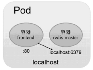另一个场景是:假如frontend 和 Redis 两个容器应用为紧耦合的关系,并且组合成一个整体对外提供服务时,应该将这两个容器打包为一个Pod,属于同一个Pod的多个容器应用之间相互访问时仅需要通过localhost就可以通信。如图: