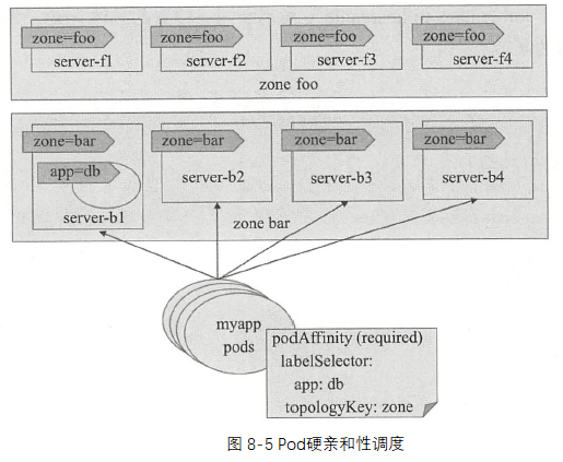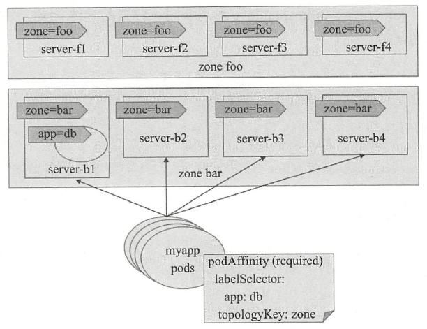 基于单一节点的 Pod亲和性只在极个别的情况下才有可能会用到,较为常用的通常是基于同一地区(region)、区域(zone)或机架( rack)的拓扑位置约束。例如部署应用程序服务(myapp)与数据库(db)服务相关的 Pod时,db Pod可能会部署于如图 8-4所示的 foo或 bar这两个区域中的某节点之上,依赖于数据服务的 myapp Pod对象可部署于 db Pod所在区域内的节点上。当然,如果 db Pod在两个区域 foo和 bar中各有副本运行,那么 myapp Pod将可以运行于这两个区域的任何节点之上。