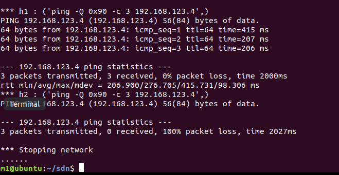 h0.cmdPrint( 'ping -Q 0x10 -c 3 ' + h1.IP() )