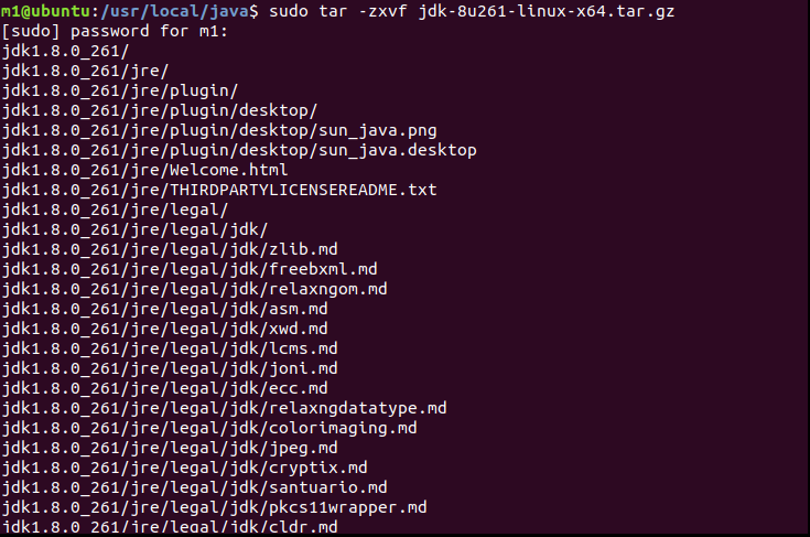 $ sudo tar -zxvf jdk-8u211-linux-x64.tar.gz //需将 jdk 压缩包提前放在相应目录下