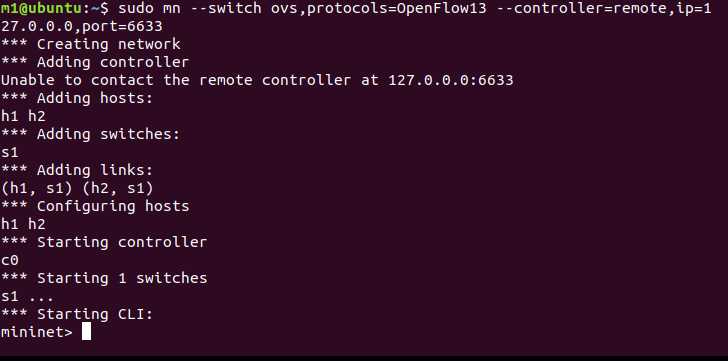 $ sudo mn --switch ovs,protocols=OpenFlow13 --controller=remote,ip=[此处填入控制器所在