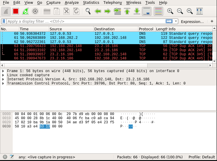 sudo wireshark 命令开启 wireshark,选择 any,抓取所有数据包。