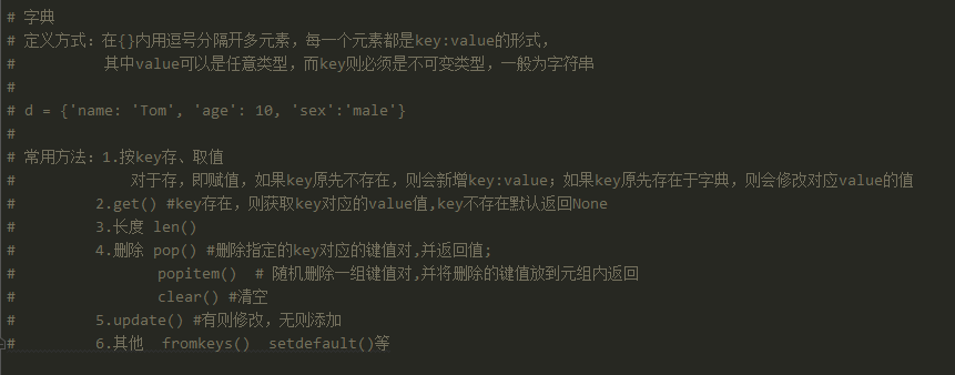 字典特性:无序,因为它没有下标,用key来当索引,所以是无序的,由此,字典的key必须是唯一的,所以字典天生去重
