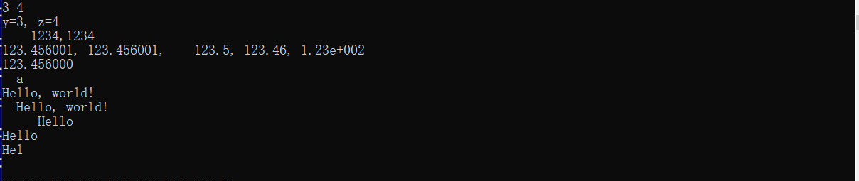 #include <stdio.h> int main() { int x=1234; float f=123.456; double m=123.456; char ch='a'; char a[]="Hello, world!"; // 定义一个数组a,数组中存放字符串常量hello,world! int y=3, z=4; printf("%d %d\n", y, z); printf("y=%d, z=%d\n", y,z); printf("%8d,%2d\n", x,x); printf("%f, %8f, %8.1f, %0.2f, %.2e\n",f,f,f,f,f); printf("%lf\n",m); printf("%3c\n", ch); printf("%s\n%15s\n%10.5s\n%2.5s\n%.3s\n",a,a,a,a,a); return 0; }