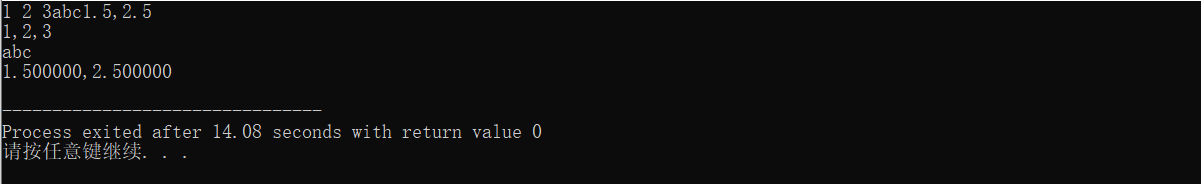 int main() { double x,y; char c1,c2,c3; int a1,a2,a3; scanf("%d%d%d",&a1,&a2,&a3); printf("%d,%d,%d\n",a1,a2,a3); scanf("%c%c%c",&c1,&c2,&c3); printf("%c%c%c\n",c1,c2,c3); scanf("%lf,%lf",&x,&y); printf("%lf,%lf\n",x,y); return 0; }