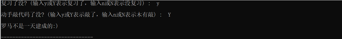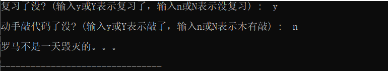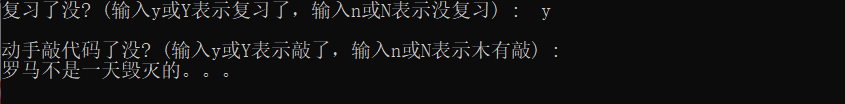 #include <stdio.h> int main() { char ans1, ans2; printf("复习了没? (输入y或Y表示复习了,输入n或N表示没复习) : "); ans1 = getchar(); // 从键盘输入一个字符,赋值给ans1 getchar(); // 思考这里为什么要加这一行 printf("\n动手敲代码了没? (输入y或Y表示敲了,输入n或N表示木有敲) : "); ans2 = getchar(); if((ans1=='y'||ans1=='Y')&&(ans2=='y'||ans2=='Y')) printf("\n罗马不是一天建成的:)\n"); else printf("\n罗马不是一天毁灭的。。。\n"); return 0; }