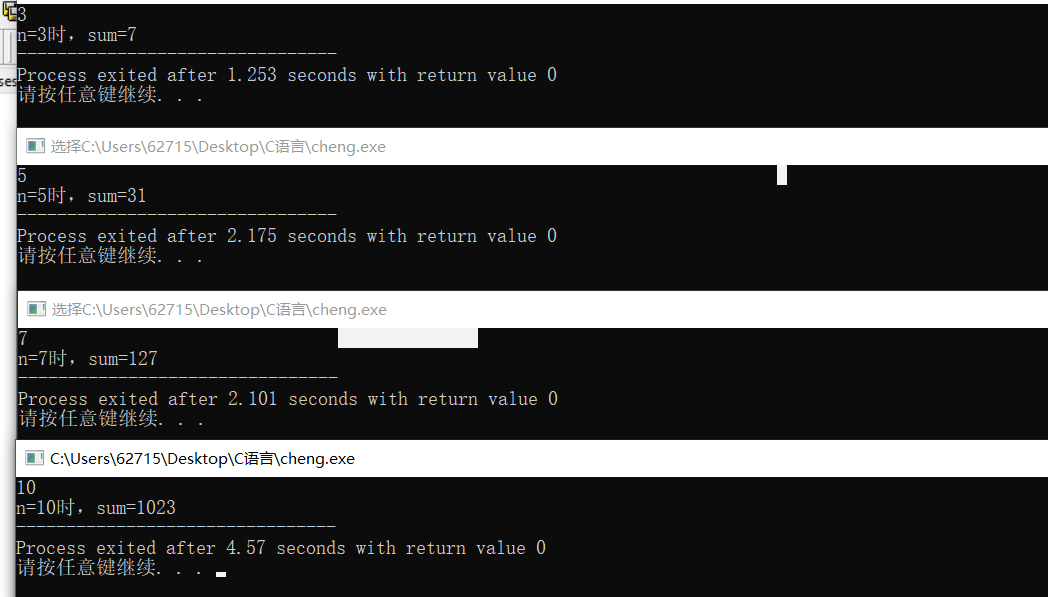 #include<stdio.h> #include<math.h> int main(){ int n,sum; scanf("%d",&n); sum=(1-pow(2,n))/(1-2); printf("n=%d时,sum=%d",n,sum); return 0; }