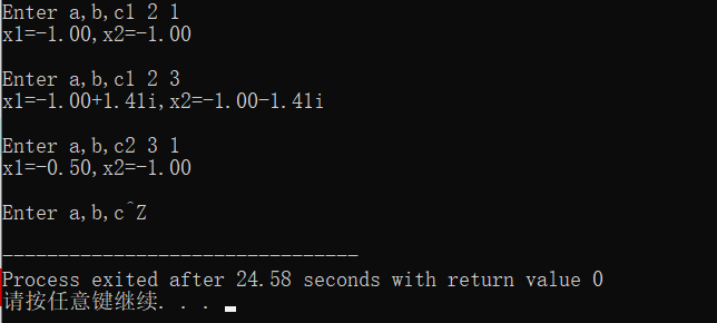 #include<math.h> #include<stdio.h> int main(){ float a,b,c,x1,x2; float delta,real,imag; printf("Enter a,b,c"); while(scanf("%f%f%f",&a,&b,&c)!=EOF){ if(a==0) printf("not quadratic equation.\n\n"); else{ delta=b*b-4*a*c; if(delta>=0){ x1=(-b+sqrt(delta))/(2*a); x2=(-b-sqrt(delta))/(2*a); printf("x1=%.2f,x2=%.2f\n\n",x1,x2); } else{ real=-b/(2*a); imag=sqrt(-delta)/(2*a); printf("x1=%.2f+%.2fi,x2=%.2f-%.2fi\n\n",real,imag,real,imag); } } printf("Enter a,b,c"); } return 0; }