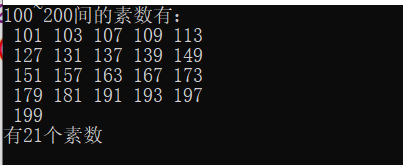 #include<stdio.h> #include<math.h> int main(){ printf("100~200间的素数有:\n"); int m,i; int count=0; for(m=100;m<=200;m++){ for(i=2;i<=sqrt(m);i++) if(m%i==0) break; if(i>sqrt(m)){ printf("%4d",m); count++; if(count%5==0) printf("\n"); } } printf("\n有%d个素数\n",count); return 0; }