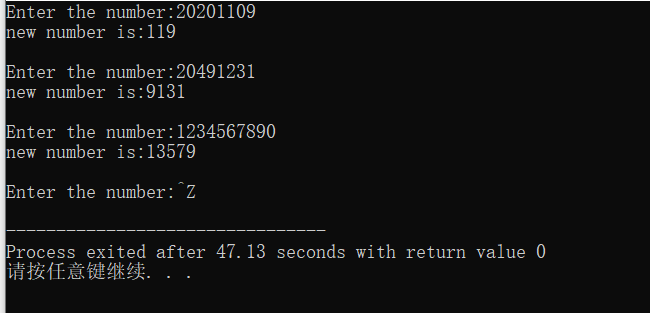 #include<stdio.h> int main(){ long num,m,odd=0; int i,j=0; printf("Enter the number:"); while(scanf("%ld",&num)!=EOF){ //先找出奇数项,并倒序输出 while(num!=0){ m=num%10; if(m%2!=0) odd=odd*10+m;//把odd作为奇数 num=num/10; } //把odd倒序输出即可得到所需结果 j=0; while(odd!=0) { i=odd%10; odd=odd/10; j=j*10+i; } printf("new number is:%d\n\n",j); printf("Enter the number:"); } return 0; }