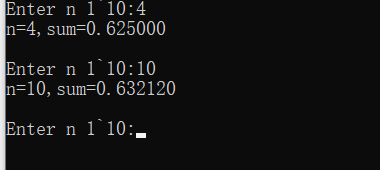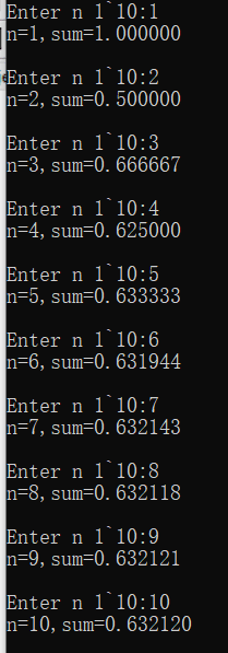 #include<stdio.h> int main(){ int i,n,k=-1; float p=1,sum=0; printf("Enter n 1`10:"); while(scanf("%d",&n)!=EOF){ p=1,sum=0,k=-1; for(i=1;i<=n;i++){ p=p*i;//计算阶乘 k=-1*k;//控制符号 sum=sum+k/p; } printf("n=%d,sum=%f\n\n",n,sum); printf("Enter n 1`10:"); } return 0; }
