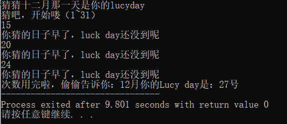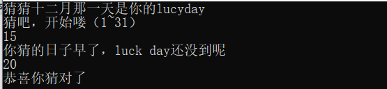 #include<stdio.h> #include<stdlib.h> #include<time.h> #define N 1 int main(){ int x,n,i,a; //生成随机数并赋值给x srand(time(0)); n=0; do{ n++; x=rand()%31+1; }while(n<N); //判断 printf("猜猜十二月那一天是你的lucyday\n猜吧,开始喽(1~31)\n"); for(i=1;i<=3;i++) { scanf("%d",&a); if(a==x){ printf("恭喜你猜对了"); break; } if(a>x) printf("你猜的日子晚了,luck day悄悄溜到前面了\n"); if(a<x) printf("你猜的日子早了,luck day还没到呢\n"); } if(i>3) printf("次数用完啦,偷偷告诉你:12月你的Lucy day是:%d号",x); return 0; }