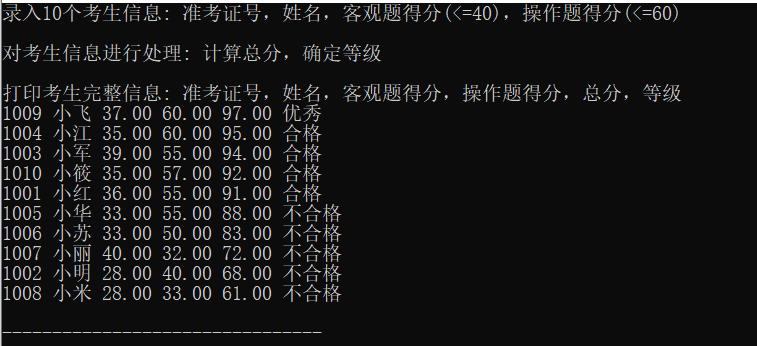 #include <stdio.h> #include <stdlib.h> #include <string.h> const int N = 10; // 定义结构体类型struct student,并定义其别名为STU typedef struct student { long int id; char name[20]; float objective; /*客观题得分*/ float subjective; /*操作题得分*/ float sum; char level[10]; }STU; // 函数声明 void input(STU s[], int n); void output(STU s[], int n); void process(STU s[], int n); int main() { STU stu[N]; printf("录入%d个考生信息: 准考证号,姓名,客观题得分(<=40),操作题得分(<=60)\n", N); input(stu, N); printf("\n对考生信息进行处理: 计算总分,确定等级\n"); process(stu, N); printf("\n打印考生完整信息: 准考证号,姓名,客观题得分,操作题得分,总分,等级\n"); output(stu, N); return 0; } // 从文本文件examinee.txt读入考生信息:准考证号,姓名,客观题得分,操作题得分 void input(STU s[], int n) { // 补足代码 FILE *fin; int i; fin = fopen("examinee.txt", "r"); if( !fin ) { printf("fail to open examinee.txt\n"); exit(0); } for(i=0;i<n;i++){ fscanf(fin,"%ld %s %f %f",&s[i].id,s[i].name,&s[i].objective,&s[i].subjective); } fclose(fin); } // 输出考生完整信息: 准考证号,姓名,客观题得分,操作题得分,总分,等级 // 不仅输出到屏幕上,还写到文本文件result.txt中 void output(STU s[], int n) { // 补足代码 FILE *fout; int i; fout = fopen("result.txt", "w"); for (i=0;i<n;i++){ printf("%ld %s %.2f %.2f %.2f %s\n",s[i].id,s[i].name,s[i].objective,s[i].subjective,s[i].sum,s[i].level); fprintf(fout,"%ld %s %.2f %.2f %.2f %s\n",s[i].id,s[i].name,s[i].objective,s[i].subjective,s[i].sum,s[i].level); } fclose(fout); } // 对考生信息进行处理:计算总分,排序,确定等级 void process(STU s[], int n) { // 补足代码 int i,j; STU temp; for (i=0;i<n;i++) s[i].sum=s[i].objective+s[i].subjective; for(i=0;i<n-1;i++){ for(j=0;j<n-i-1;j++){ if(s[j].sum<s[j+1].sum){ temp=s[j]; s[j]=s[j+1]; s[j+1]=temp; } } } for(i=0;i<n;i++){ if(i<0.1*n) strcpy(s[i].level,"优秀"); else if(i>=0.1*n&&i<0.5*n) strcpy(s[i].level,"合格"); else strcpy(s[i].level,"不合格"); } }