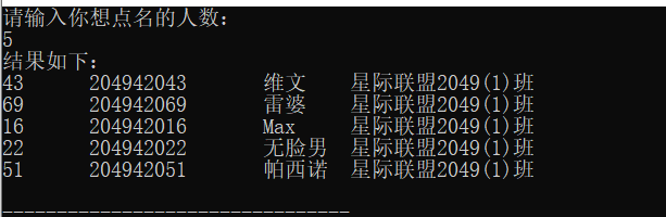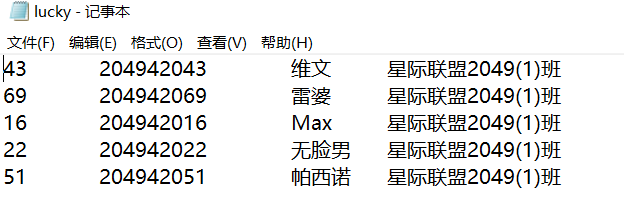 #include<stdio.h> #include<stdlib.h> #include<math.h> #include<time.h> #define N 80 typedef struct student { int num; long int id; char name[20]; char classs[40]; }STU; int x,i,n; void input(STU s[]); void output(STU s[], int n); int main(){ STU s[N]; printf("请输入你想点名的人数:\n"); input(s); scanf("%d",&n); printf("结果如下:\n"); output(s,n); return 0; } void input(STU s[]) { FILE *fin; int i; fin = fopen("list.txt", "r"); if( !fin ) { printf("fail to open list.txt\n"); exit(0); } for(i=0;i<N;i++){ fscanf(fin,"%d %ld %s %s",&s[i].num,&s[i].id,s[i].name,s[i].classs); } fclose(fin); } void output(STU s[], int n){ FILE *fout; fout = fopen("lucky.txt", "w");//创建lucky.txt for(i=0;i<n;i++){ x=rand()%N+1; //生成1~80的随机数 printf("%d\t%ld\t%s\t%s\n",s[x].num,s[x].id,s[x].name,s[x].classs); fprintf(fout,"%d\t%ld\t%s\t%s\n",s[x].num,s[x].id,s[x].name,s[x].classs); } }