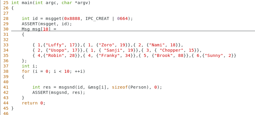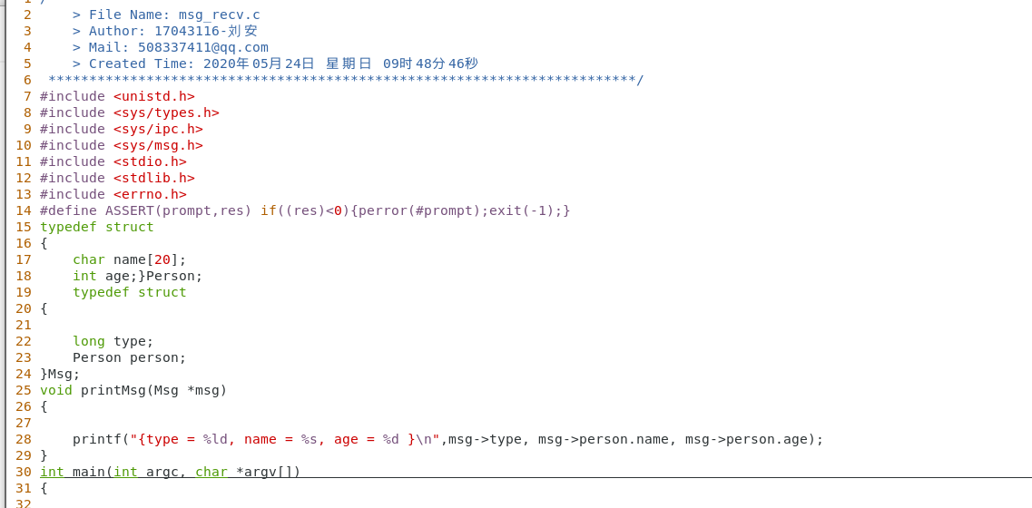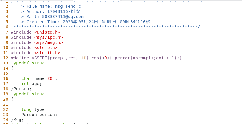 编写两程序分别用于向消息队列发送数据和接收数据。 msg_send 程序定义了一个结构体 Msg , 消息正文部分是结构体 Person 。该程序向消息队列发送了 10 条消息