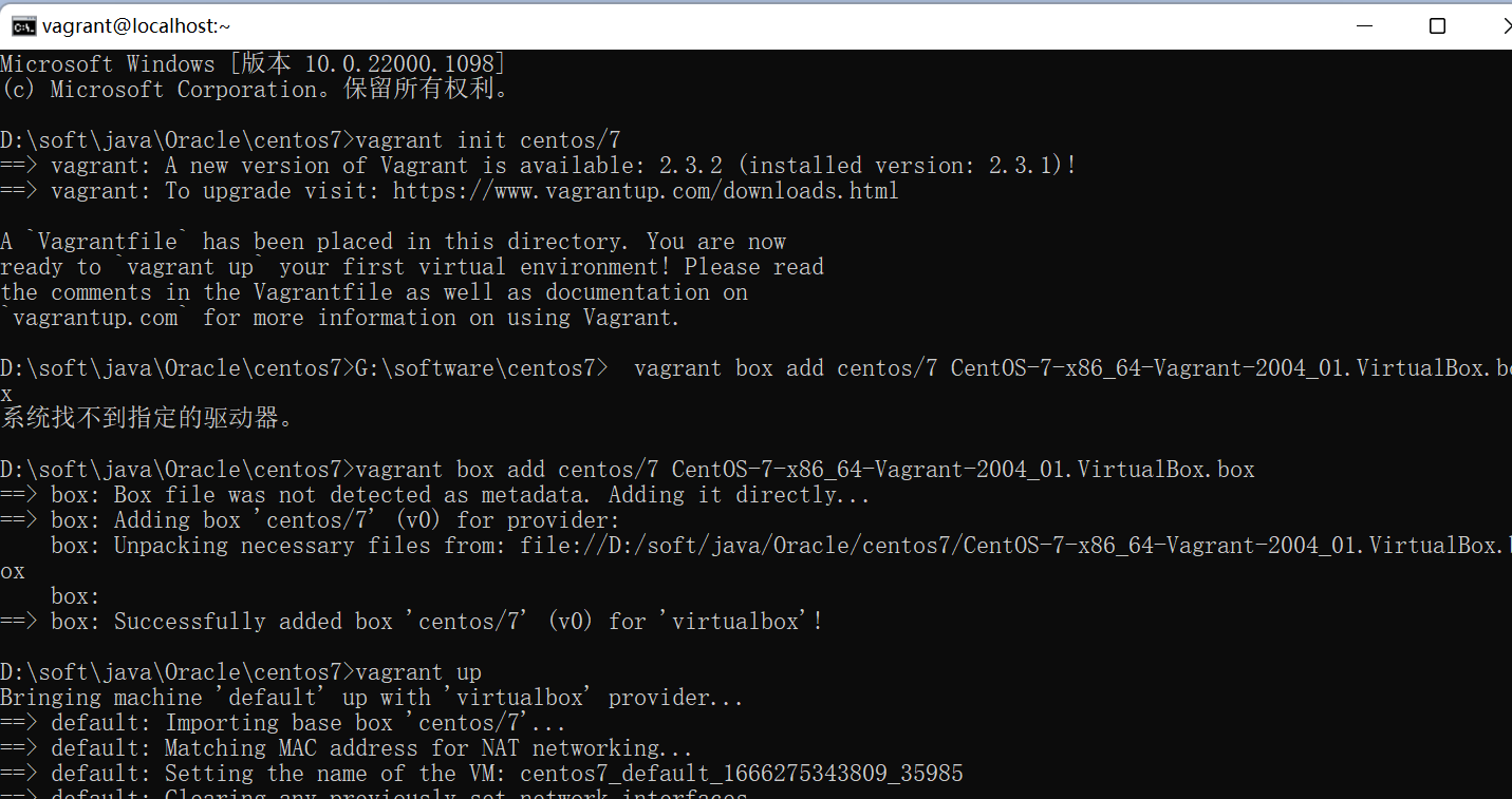 然后执行命令 vagrant box add centos/7 CentOS-7-x86_64-Vagrant-2004_01.VirtualBox.box