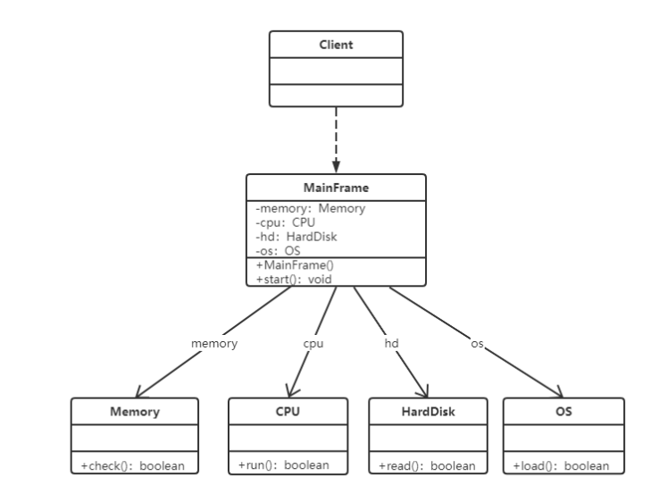 在计算机主机(Mainframe)中,只需要按下主机的开机按钮(on()),即可调用其他硬件设备和软件的启动方法 ,如内存(Memory)的自检(check())、CPU的运行(run())、硬盘(HardDisk)的读取(read())、操作系统(OS)的载入(load()),如果某一过程发生错误则计算机启动失败。