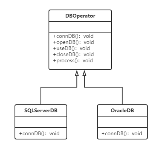 对数据库的操作一般包括连接、打开、使用、关闭等步骤,在数据库操作模板类中我们定义了connDB()、openDB()、useDB()、closeDB()四个方法分别对应这四个步骤。对于不同类型的数据库(如SQL Server和Oracle),其操作步骤都一致,只是连接数据库connDB()方法不同,现使用模板方法模式对其进行设计。