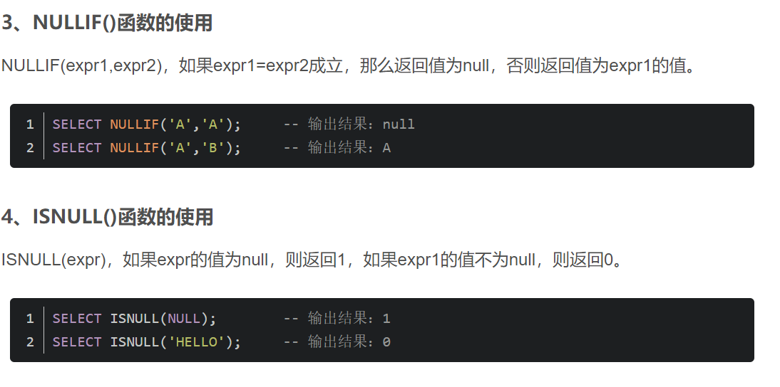 ifnull() 它接受两个参数,如果不是NULL,则返回第一个参数。 否则,IFNULL函数返回第二个参数。
