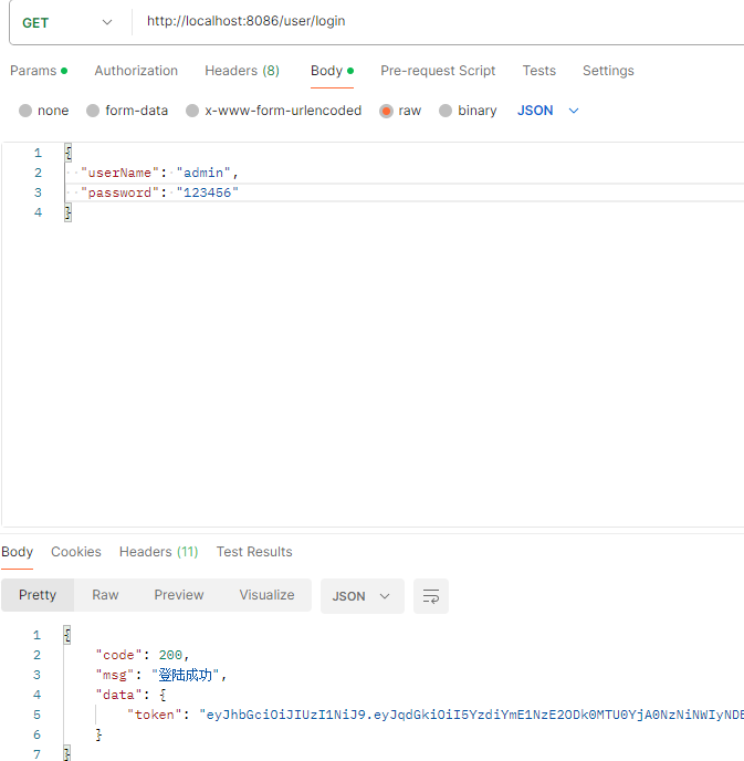 @RequestMapping("/user/login") public ResponseResult login(@RequestBody User user){ ResponseResult result = sysUserService.login(user); return result; }