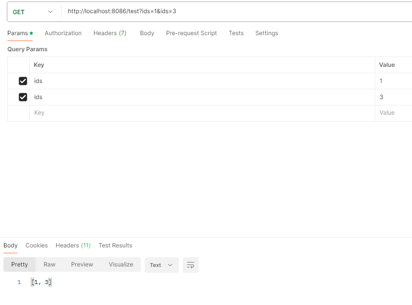 @RequestMapping("/test") public String test(@RequestParam List<Integer> ids){ String result=String.valueOf(ids.toString()); return result; }