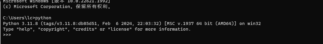 cmd输入python命令,出现如下即为成功,失败可检查环境变量是否成功添加