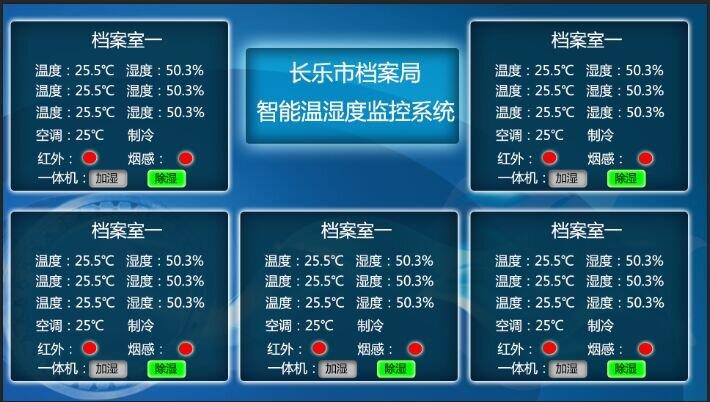 监控档案室内重要部位的湿度情况,如对各类空调进出水管沿线的漏水检测以及漏水的水位检测,记录湿度曲线方便管理员查询,一旦发现湿度越限即刻发出警报,提醒管理人员及时调整空调的工作设置值或调整机房内的设备分布情况。