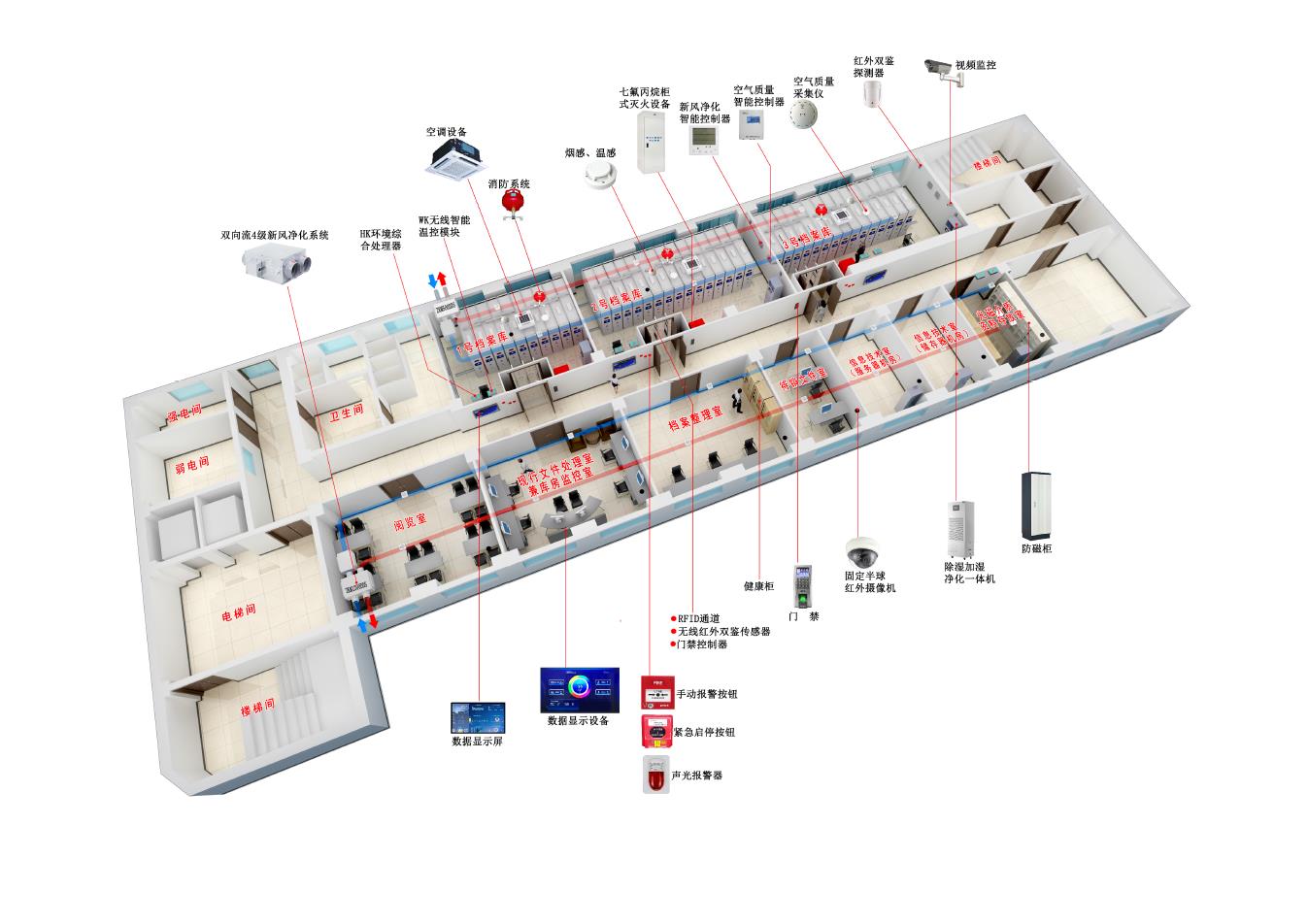 恒温恒湿设备、传感器、空气净化消毒设备、红外防盗设备、出入门禁设备、智能灯光照明设备、监控设备等集中一体化管理,以统一专用设备接口接入库房局域网总线,各功能设备独立运行的同时,根据设定逻辑和特定要求联动运行,实现档案的智能化存取、档案库房温湿度的智能调节、档案库房空气质量的采集及净化,有效地保证了档案的安全与寿命。