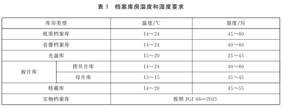 5.1.2 档案库房温度和湿度应符合表1的要求。档案库房应维持温度和湿度相对稳定,温度日较差≤±2 ℃,湿度日较差≤±5%。温度和湿度取值应充分考虑设备的测量和控制精度,避开表1上下限附近,取值不应同时为双上限值或双下限值。