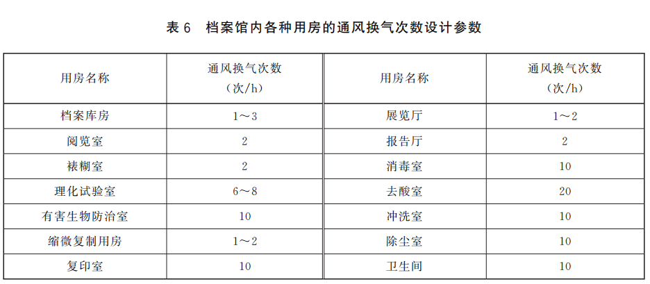 5.2.3 档案馆内各种用房的通风换气次数设计参数应符合表6的规定。