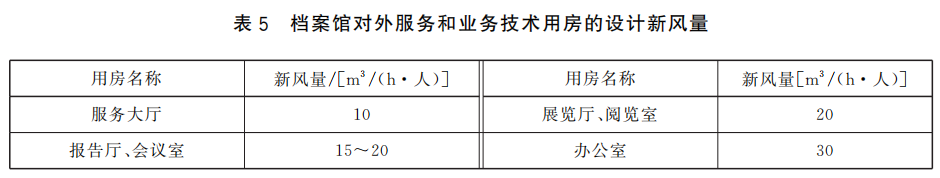 5.2.2 档案馆对外服务和业务技术用房的设计新风量应符合表5的规定。