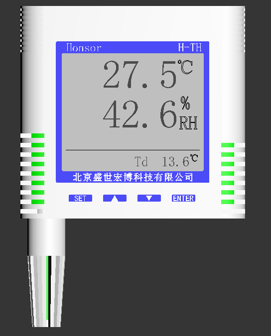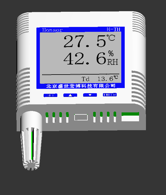 大屏液晶显示 配备清晰的液晶显示屏(LCD),实时直观显示当前环境的温度(分辨率通常为 0.1℃)、湿度(分辨率 0.1% RH)以及其他相关参数(如露点温度、设备地址、波特率、日期时间等)。操作按键(向上 / 向下键)可切换显示内容,便于现场快速查看和参数设置。