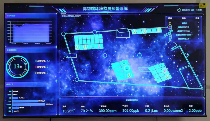 • 指标覆盖要全面,库房需集成 PM2.5/PM10、甲醛、TVOC,青铜器库房额外配置 SO₂/NO₂传感器,展厅需包含 CO₂参数。