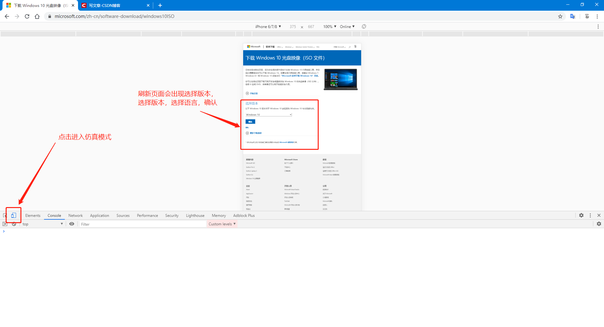 二、按 F12 并且进入开发人员工具-仿真-模式-用户代理字符串-调出被隐藏的镜像下载页面