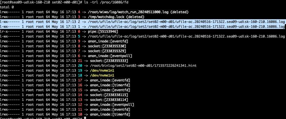 ls -trl /proc/16086/fd 可以看到,文件描述符1 2都已经重定向了