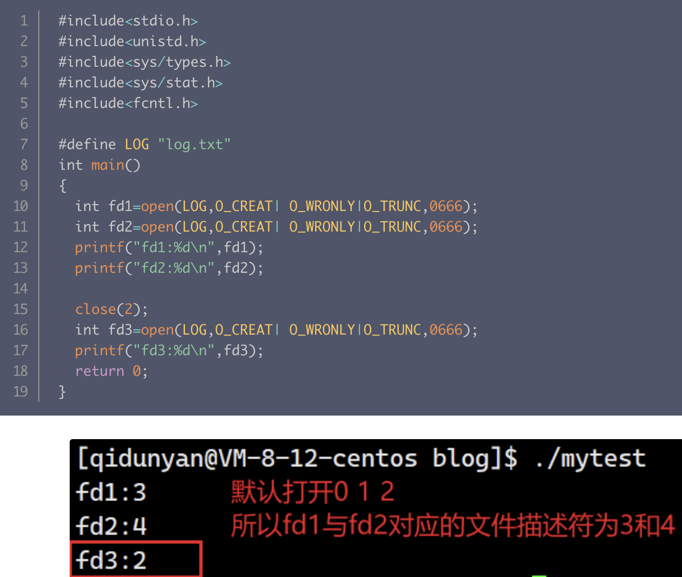 文件描述符的分配规则为从0开始,扫描文件描述符表中,没有被使用的数值最小的下标,作为新打开文件的文件描述符
